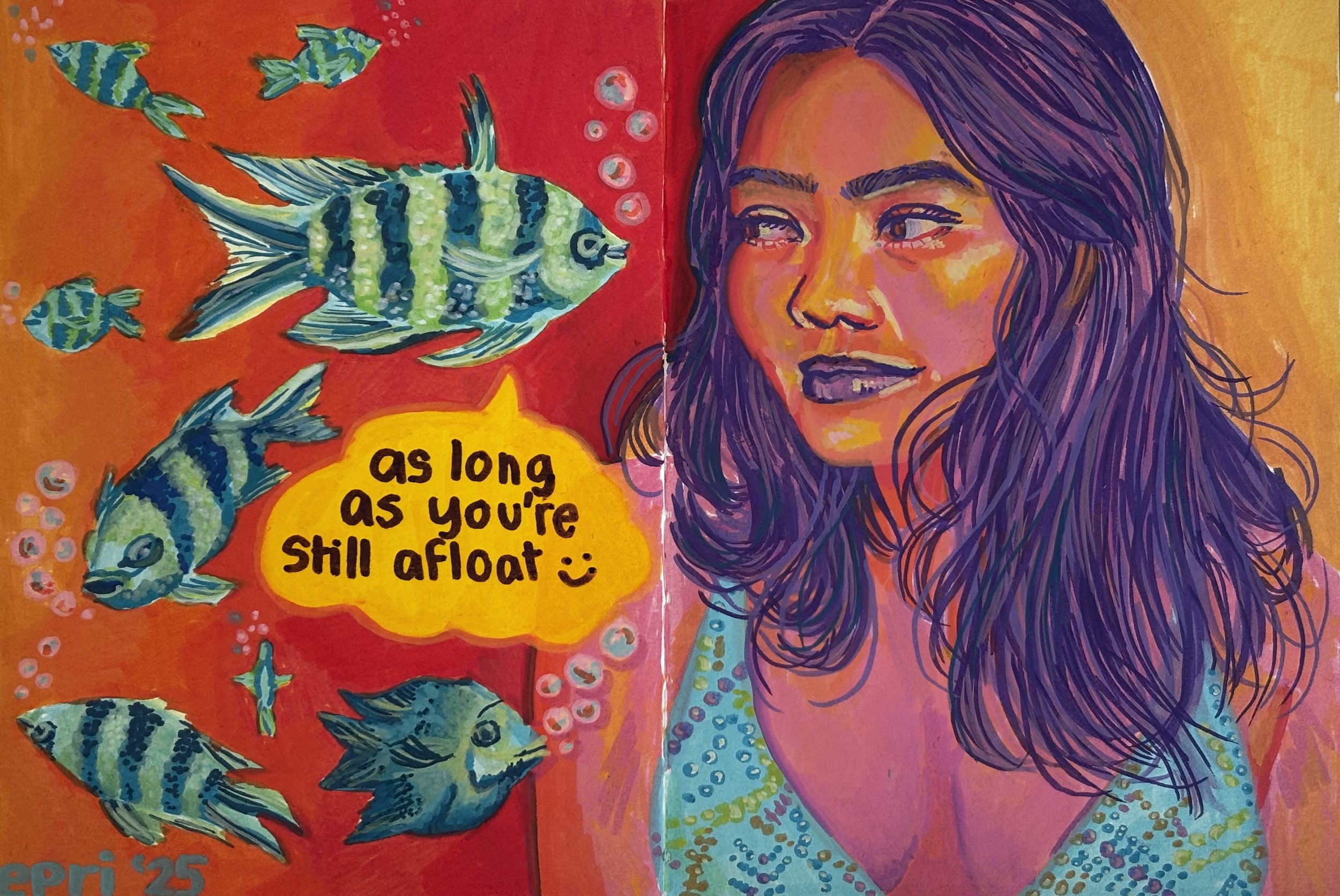 Erika Isleta is a Filipino artist based in Taguig City, Philippines. She is a 2025 graduate of the University of the Philippines College of Fine Arts, with a Bachelor's Degree in Fine Arts, majoring in Painting. Creating has been a part of her life for as long as she could hold a pencil, and she loves to translate the whimsical nonsense in her head into art. Though she loves to paint with acrylic, she likes to experiment with different mediums, such as watercolor, acrylic markers, sometimes gouache and oil, and of course, a classic ballpoint pen. She has basic academic experience with wheel throwing, pottery, working with plaster, and welding from UPCFA, but thoroughly enjoyed learning about printmaking above all! She has more recently been sharpening her digital art skills and loves to experiment with different art styles on Procreate. In her free time, she enjoys journaling, scrapbooking, crocheting, and experimenting with different arts and crafts.